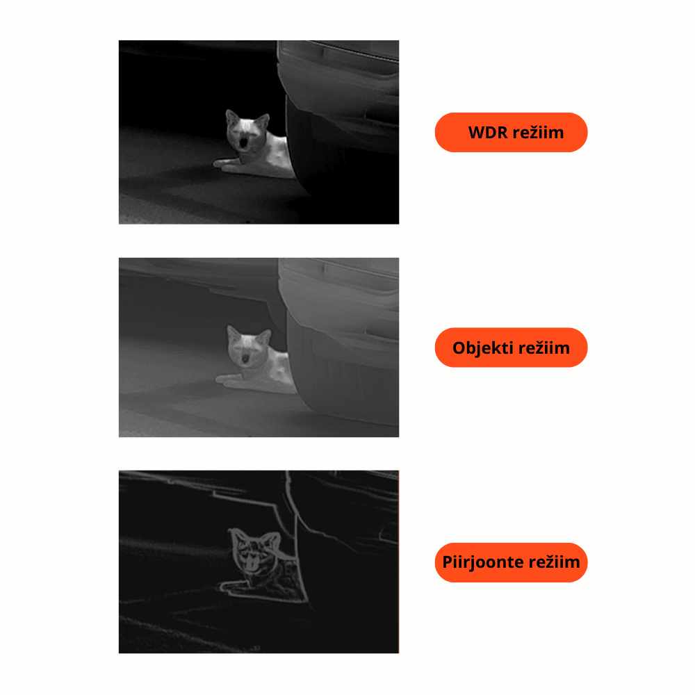 Võimalus on kasutada objekti, kontuuri ning laia dünaamilise vaate (WDR) režiime. Objekti režiim tagab sihtmärgi fokuseerituma vaate, laia dünaamilise vaate (WDR) režiim sobib kasutamiseks kõrge kontrastsusega valgustingimustesse ning kontuuri režiim on välja töötatud selleks, et pakkuda pimedas paremat arusaama sihtmärgi kujust.