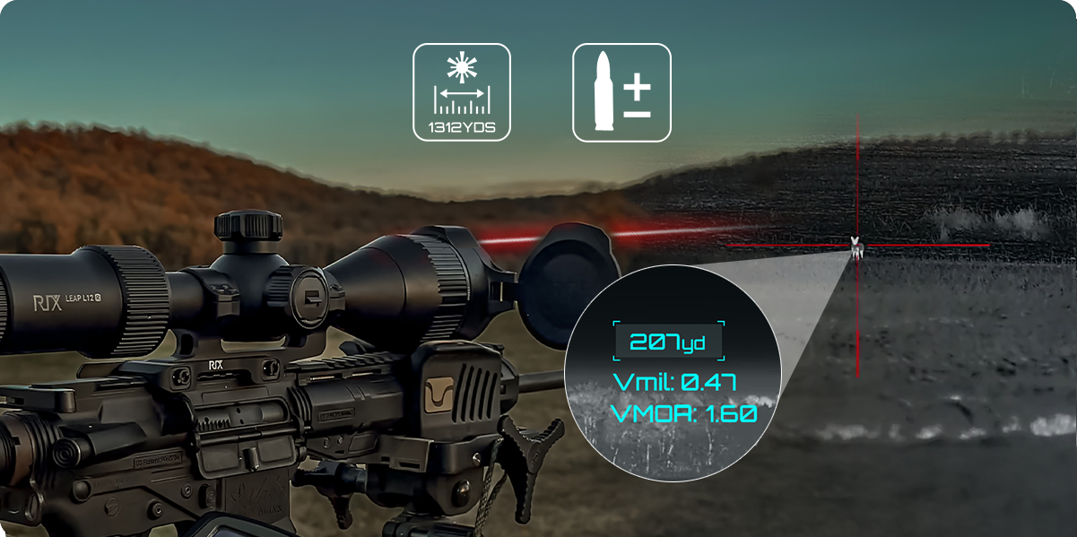 Erinevalt välistest kaugusmõõtjatest, mis vajavad seadistamist ja kalibreerimist, on LEAP L12R-i laserkaugusmõõtja integreeritud otse objektiivi lähedale optilisele teljele, võimaldades koheselt täpseid mõõtmisi ilma lisaseadistusteta. Mõõtmisulatus kuni 1200 meetrit.